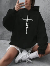 Trendy Tron Plus Size Faith Print Hoodie with Pockets - Stylish Black Long Sleeve Sweatshirt for Fall & Winter