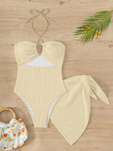 Trendy Tron Chic Hollow-Out Halter Neck One-Piece Swimsuit Set with Cover-Up for Summer Beach Getaways