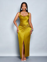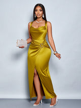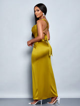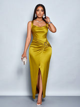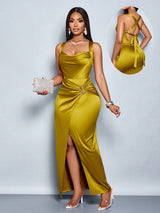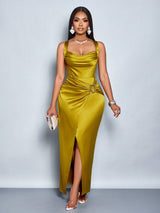 Trendy Tron Elegant Satin Cowl Neck Backless Dress with Metal Detail for Christmas Parties and Special Occasions