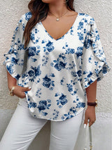 Trendy Tron Floral Print Ruffle Sleeve Plus Size Blouse for Summer Casual Wear